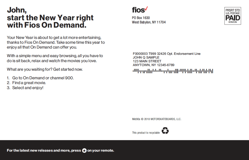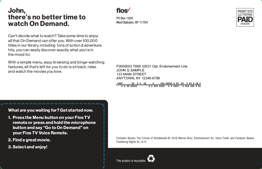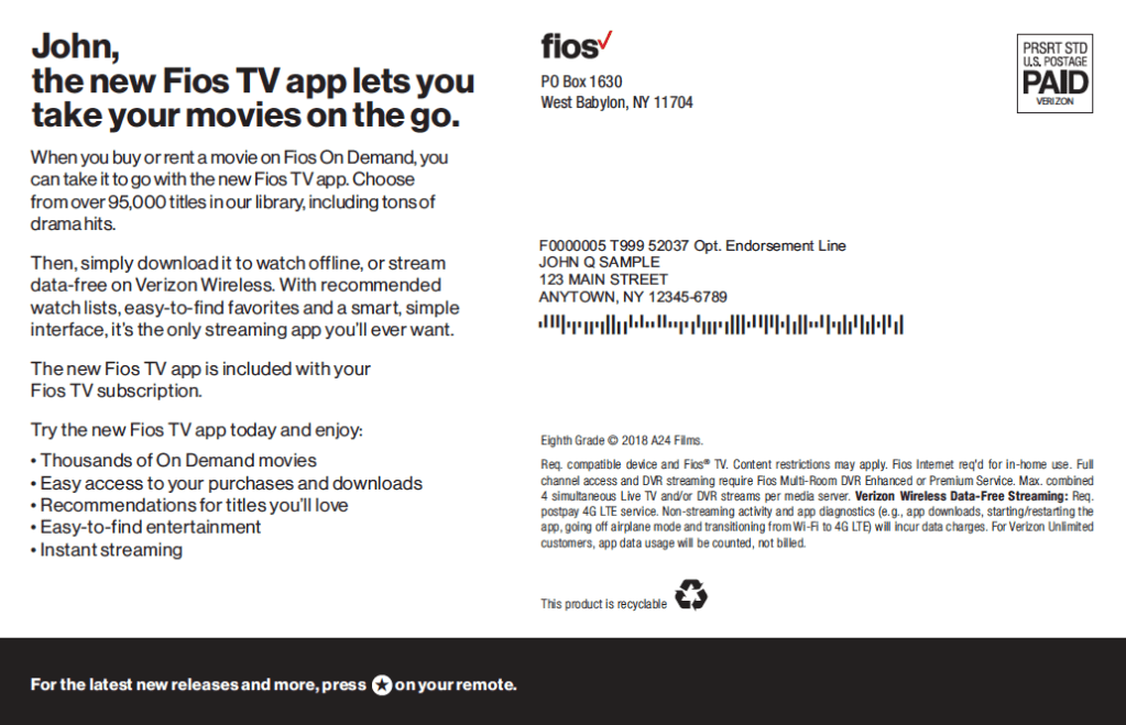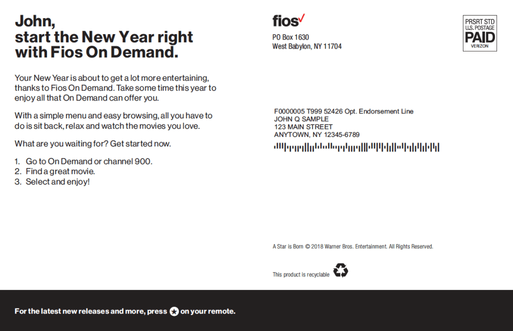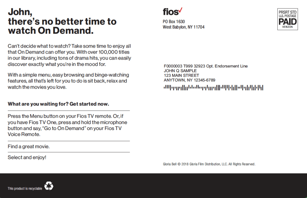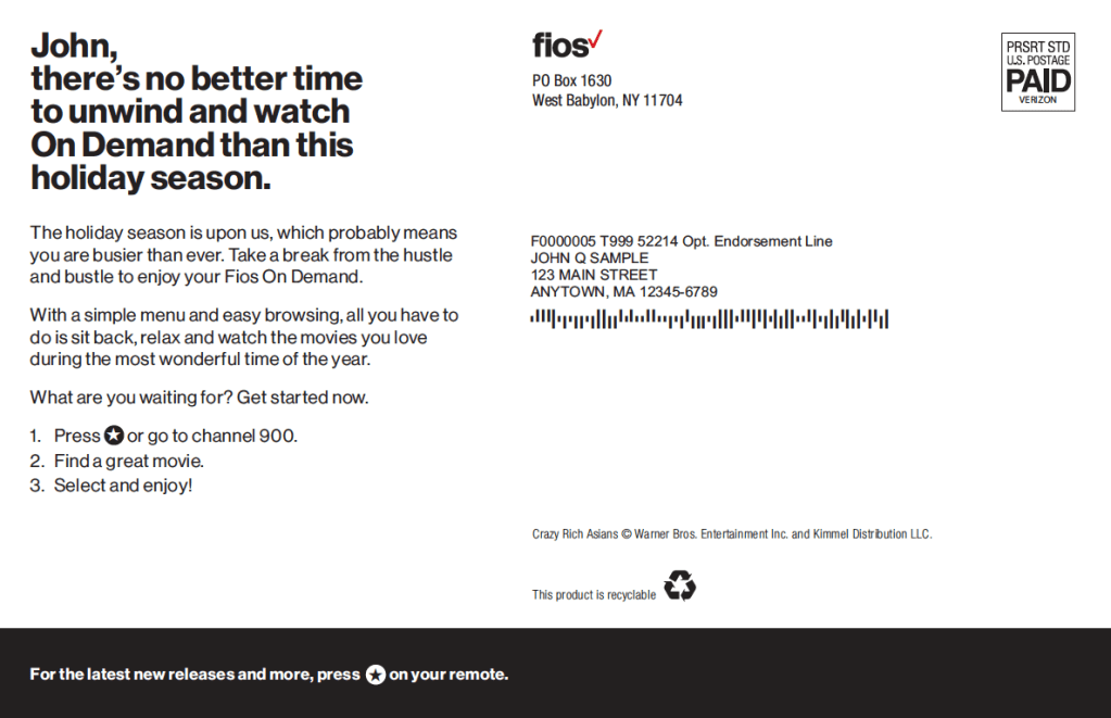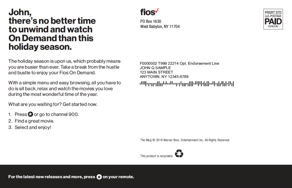 Brief: Create a postcard with a catchy headline that highlights Verizon’s latest On Demand movies.