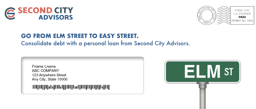 “Consolidating Your Debt is Easy” Second City Advisors Brief: Update OE (outer envelope) messaging for Second City Advisors with personalized street addresses. Related
